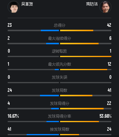 尽管这一场比赛是两名选手在本届世锦赛的首秀,但对彼此并不陌生的二人,一上来就打得非常有侵略性,接发球后不约而同选择了提速,想要给自己下压创造机会,不过明显高昉洁进入状态更快,早早确立起了3-1的领先,虽然接下来出现了一些无谓失误,让吴堇溦迅速追平了比分,但是在5平之后,高昉洁控制住了失误,再次拉开比分,以11-8结束了前半局的争夺。